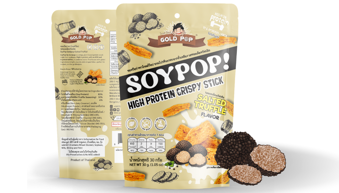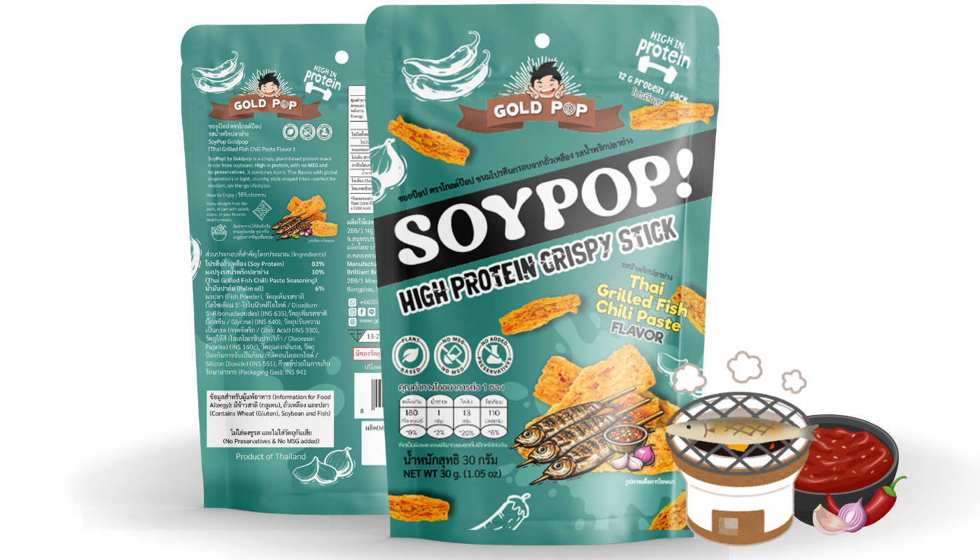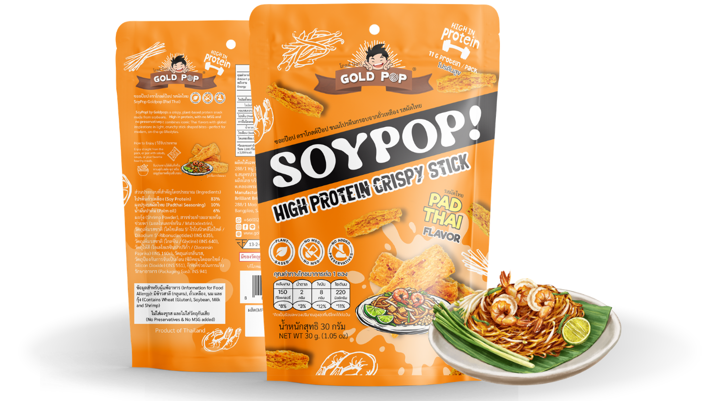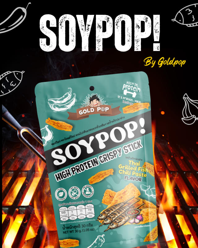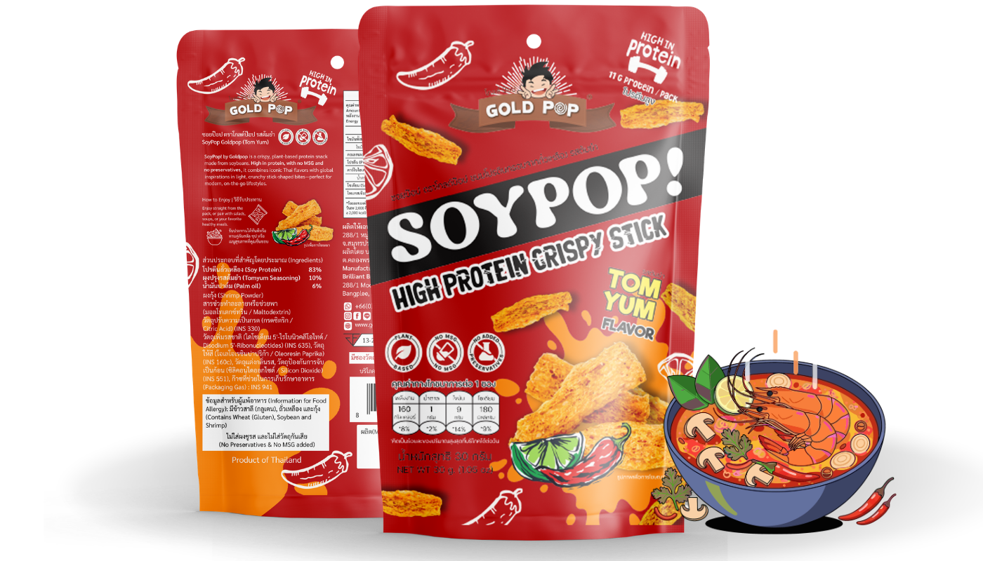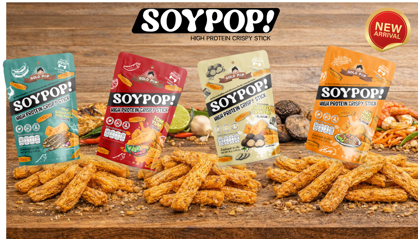 SoyPop! by Goldpop คือขนมโปรตีนจากพืชแบบกรอบ ที่ผสานแรงบันดาลใจจากรสชาติไทยและระดับโลก ผลิตจากโปรตีนถั่วเหลืองคุณภาพสูง ให้เนื้อสัมผัสกรอบ เบา และอร่อยอย่างลงตัวในทุกคำ
